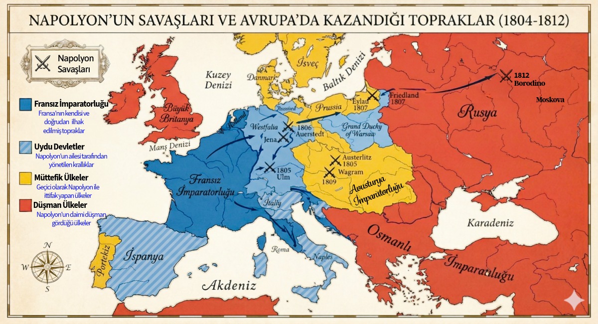 Napolyon denizdeki başarısızlığa rağmen karada büyük bir üstünlük kurdu. 1805 sonbaharında Grande Armée’yi Almanya’ya yöneltti, Ulm’de Avusturya ordusunu kuşatıp teslim aldı ve ardından Viyana’ya girdi. Bu zaferlerin zirvesi, 2 Aralık 1805’teki Austerlitz Savaşı oldu. Napolyon burada Rus ve Avusturya ordularını ustaca bir planla bozguna uğrattı. Bu zafer yalnızca bir savaş başarısı değildi; Avrupa’nın siyasal yapısını değiştiren bir dönüm noktasıydı. Kutsal Roma İmparatorluğu çözüldü, onun yerine Napolyon’un etkisi altındaki Ren Konfederasyonu kuruldu. Kuzey İtalya’da kendi krallığını oluşturdu ve Almanya ile İtalya’daki birçok devleti yeniden düzenledi. Prusya ise 1806’da, Jena ve Auerstadt savaşlarında elde edilen zaferlerle neredeyse tamamen ezildi; Fransız ordusu Berlin’e girdi. Böylece Napolyon birkaç yıl içinde kıta Avrupa’sında benzersiz bir üstünlük kurdu.