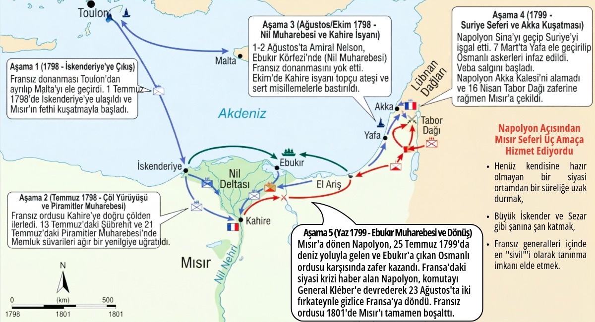 1798’de Napolyon rotasını Mısır’a çevirdi. Bu girişimin birkaç amacı vardı: İngiltere’nin Hindistan yolunu tehdit etmek, Fransa’dan bir süre uzaklaşıp siyasî gerilimden kaçınmak ve Büyük İskender ile Sezar gibi Doğu’da bir imparatorluk kurma hayalini denemek. Seferin dikkat çekici yönlerinden biri, yalnızca askerî değil kültürel ve bilimsel bir proje olarak da sunulmasıydı. Napolyon yanında yaklaşık 160 bilim insanı, sanatçı ve mühendisi götürdü; bunlar Mısır’ın doğasını, tarihini ve anıtlarını inceleyerek Avrupa’ya büyük bilgi aktarımında bulundu. Bu süreçte Rosetta Taşı’nın bulunması, Mısır uygarlığının çözülmesinde tarihî bir dönüm noktası oldu.