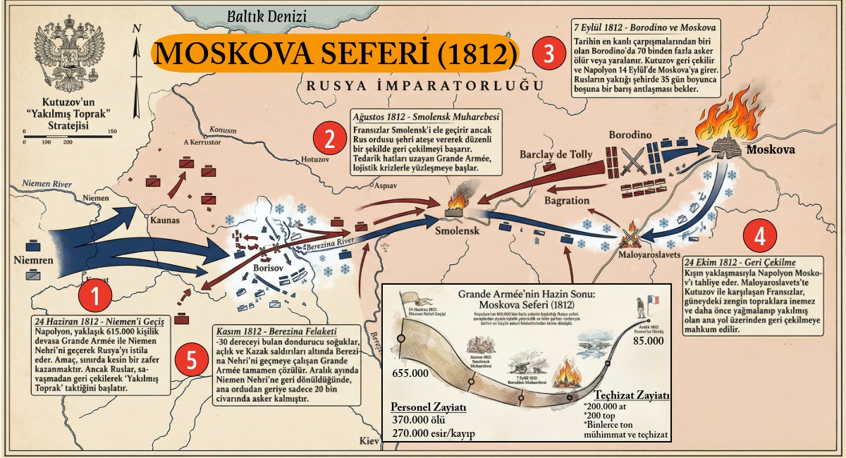 1812 yazında Napolyon, Avrupa tarihinin en büyük ordularından biriyle Rusya’ya girdi. Yaklaşık 655.000 askerden oluşan Grande Armée, farklı milletlerden birlikleri barındıran devasa bir güçtü. Napolyon’un stratejisi hızlı ilerlemek, Rus ordusunu büyük bir meydan savaşında yok etmek ve Rusya’yı barışa zorlamaktı. Ancak Rus komutanlar bu planı boşa çıkardı. Sürekli geri çekilerek Fransız ordusunu ülkenin içlerine çektiler. Geri çekilirken depoları, köyleri ve erzakları yok ettiler. Bu yakıp yıkma taktiği, Fransız ordusunun ikmal sistemini çökertti.